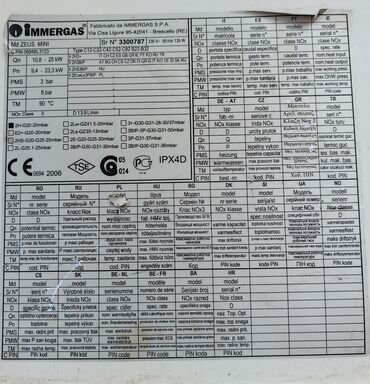 - İşləmə təzyiq diapazonları (qaz): G20 20–25 mbar, G30/G31 müxtəlif diapazonlar (etiketdə qeyd olunub)