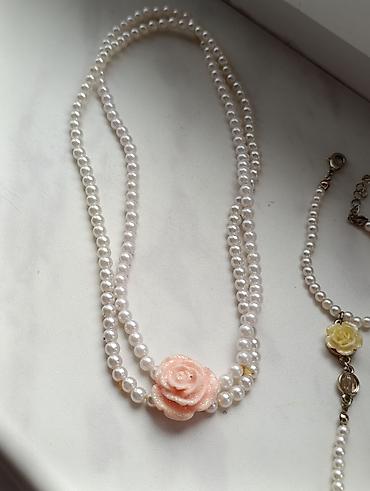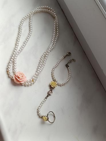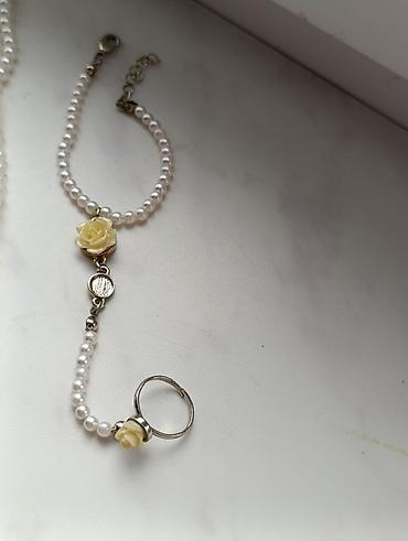 - İnci qolbaq və üzük birləşməli əl bəzəyi: tənzimlənə bilən zəncirli qulplu qolbaq, mərkəzdə krem rəngli qızılgül asqısı, incilərdən ibarət zəncir vasitəsilə dekorativ üzüyə birləşir. Üzükdə eyni krem rəngli qızılgül detalları mövcuddur.