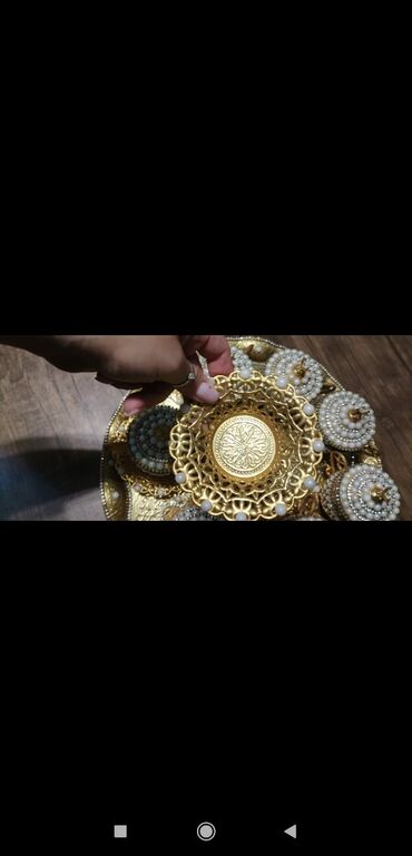 - Fincanaltılar: Ajür naxışlı qızılı rəngdə metal, üzərində dekorativ incilər.