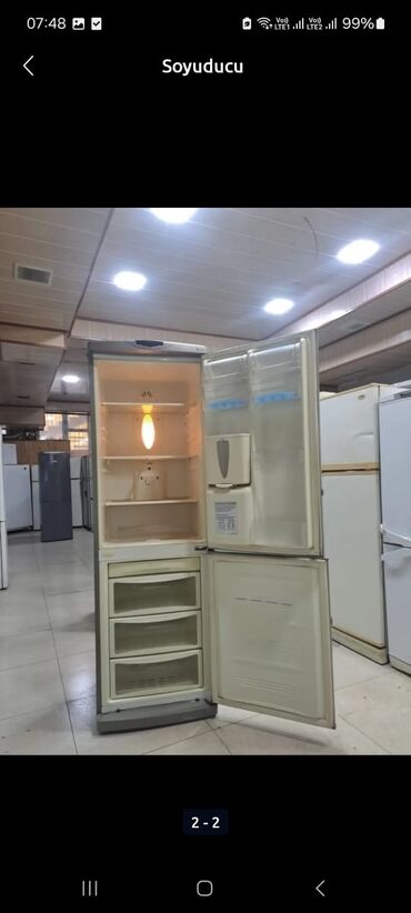 İki kameralı soyuducu - Üst kamera: dondurucu bölmə, ayrıca qapı - Alt kamera: soyuducu bölmə, 3 ədəd tənzimlənən rəf, alt hissədə tərəvəz üçün iki iri konteyner - Qapı rəfləri: 3 səviyyəli saxlam...