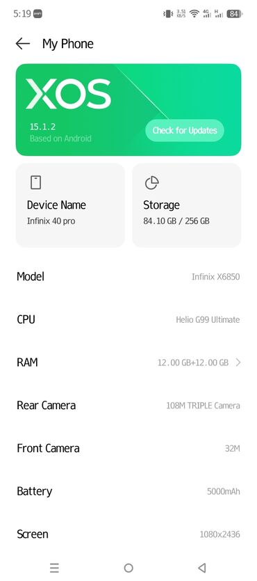 - Yaddaş: 256 GB daxili storage (şəkildə 84.10 GB istifadə olunub)
