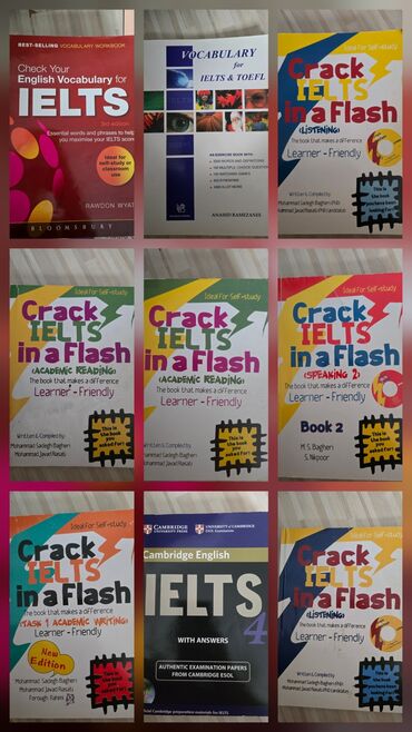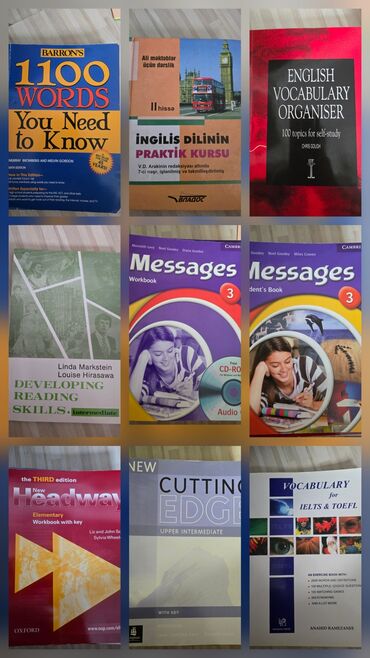 Digər ilİngilis dili kitabları. 1ci şəkildə abituriyentlər üçün, 2 və 3cü şəkillərdə IELTS/TOEFL üçün, və 4cü şəkil Talıbov test toplusu. Qrammatika qaydaları, lüğət, müxtəlif mövzularda mətnlər, test topluları və IELTS/TOEFL hazırlıq kitabları var. İşlənmiş və yeni kitablar da var. Kitablar:"DİM" test topluları, "English Vocabulary Organiser", "1100 Words You Need to Know", "Messages" seriyası (iş dəftəri və kitabı), "Developing Reading Skills", "New Headway", "Cutting Edge", "Crack IELTS in a Flash" seriyası, "Vocabulary for IELTS & TOEFL", "IELTS with Answers"