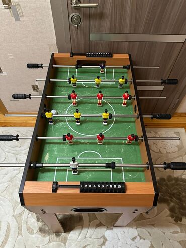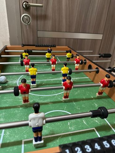 Futbol oyun stolu - Taxta görünümlü korpus, yaşıl meydança üstü futbol sahəsi işarələmələri ilə - 2 komanda: qırmızı və sarı formalı fiqurlar + qapıçılar - Hər qapı üstündə 0–10 arası mexaniki hesa...