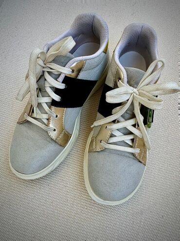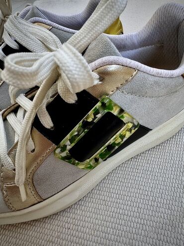 - Rənglər: açıq boz süet üst, qızılı metalik panellər, yan tərəfdə geniş qara zolaq, daban hissəsində parlaq sarı detal