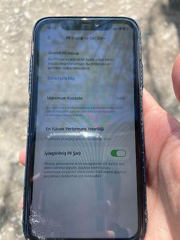 - Batareya məlumatı: Maksimum tutum 99% göstərilir. Sistem “Bu iPhone-un orijinal Apple pilinə sahib olduğu doğrulanmır” bildirişi çıxarır. “İləşdirilmiş Pil Şarjı” funksiyası aktivdir.