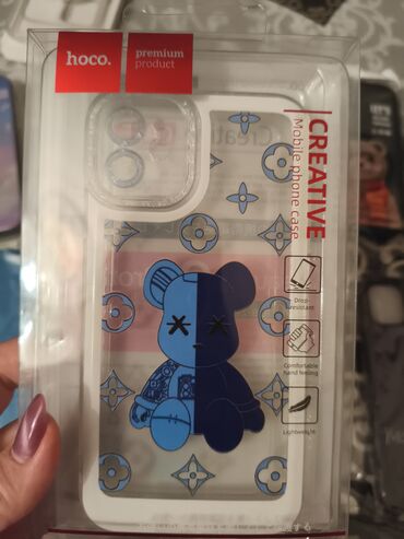 - Hoco Creative seriyası – şəffaf/ağ çərçivə üzərində mavi ayı printi, premium məhsul, yüngül, əl üçün rahat, zərbəyə davamlılıq qeyd olunub