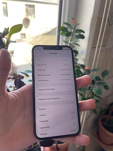 - “Haqqında” bölməsi şəkillərdə: Model adı iPhone 12 Pro, 128 GB tutum.