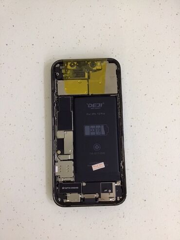 Göy rəngli iPhone 12 Pro smartfonu, arxa tərəfində üç kameralı sistemi və yan tərəfində səs düymələri və güc düyməsi ilə təchiz olunub. Cihazın arxasında Apple loqosu yerləşir. Telefonun daxili hissələri, o cümlədən Deji markalı batareya və digər komponentlər də görünür. Bu model dəqiq və təkmilləşdirilmiş texnologiyası ilə gündəlik istifadə üçün etibarlı bir seçimdir. Tel daşı təzə deyişb100 pil di tek ekran qoymaq lazımdır isdeyenler vip əlaqə saxlaya bilər