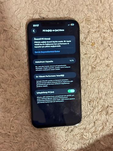 - iOS işlək vəziyyətdə göstərilir; “Pil Sağlığı və Şarj Etmə” bölməsində maksimum tutum 79% qeyd olunub, “Yüksəldilmiş Pil Şarjı” aktivdir.