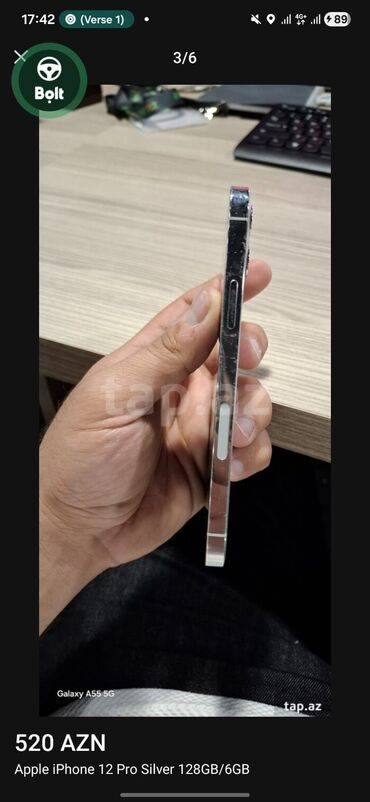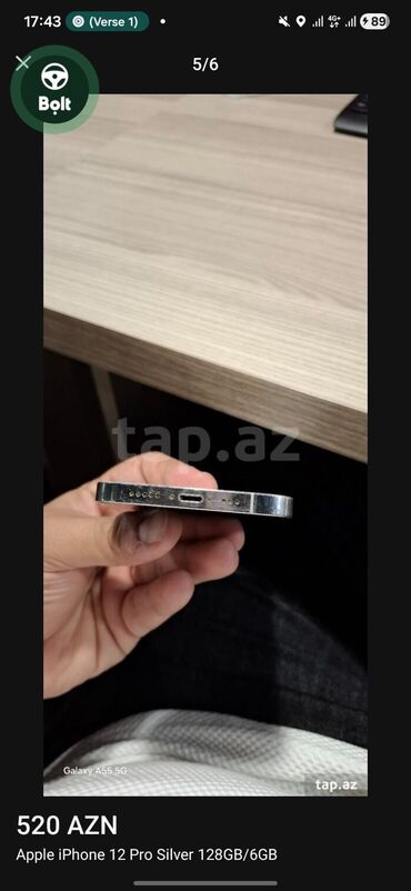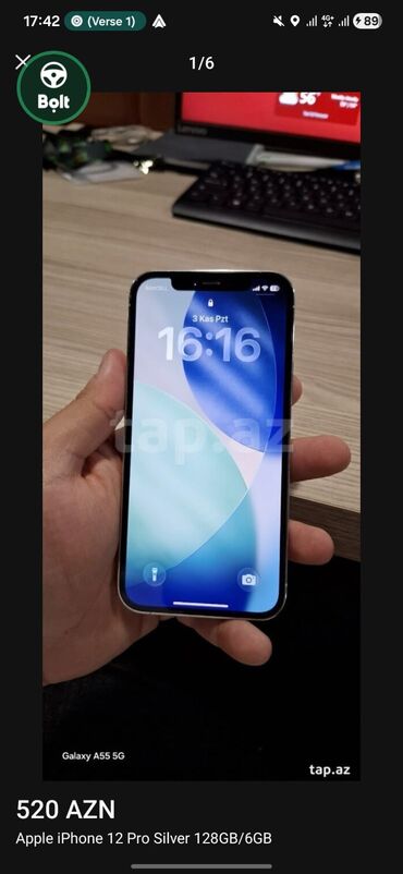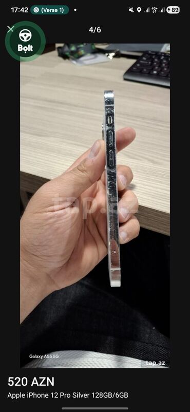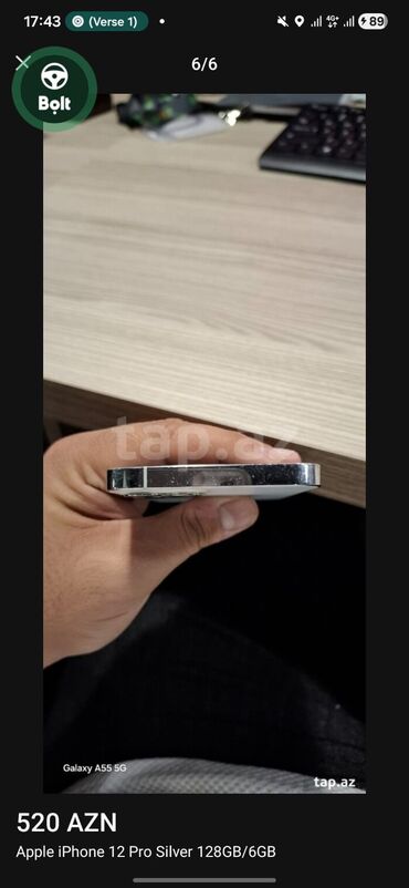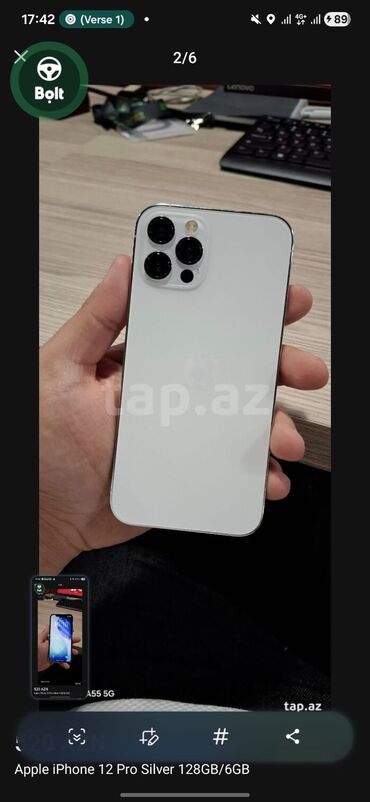 IPhone 12 Pro. Yaddaş: 128gb. Pil: 76%. Üstündə yüngül cızıqlar var, qutu və şarj aləti üstündə verilir. giymət sondur.