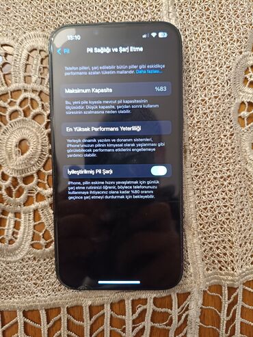 - Batareya: “Pil Sağlığı və Şarj Etmə” bölməsində maksimum tutum 83% göstərilir; “İyileştirilmiş Pil Şarjı” aktivdir