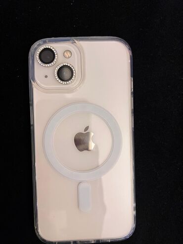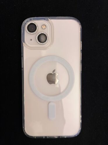 iPhone 13 ağ rəngli, ikiqat arxa kamera və Face ID ekran kəsiyi ilə. Şəkillərdə şəffaf MagSafe uyğun qoruyucu keyslə təqdim olunur; keyslə birlikdə arxa hissədə MagSafe halqası görünür. Arxa kamera...