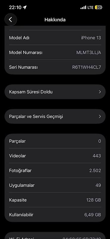 Apple iPhone 13 – 128 GB, MLPF3RM/A, mavi rəng Xüsusiyyətlər: - Yaddaş: 128 GB (təxminən 47,22 GB boş) - Rəng: Mavi - Model adı: iPhone 13 - Model nömrəsi: MLPF3RM/A - iOS versiyası: 16.2 (şəkildə...