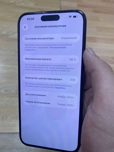 - Batareya məlumatı (ekrandan): Maksimal tutum 88%, yenidən yükləmə dövrləri 539. İstehsal tarixi: Noyabr 2023. İlk istifadə: Yanvar 2024. “Batareyanın vəziyyəti: Normal”.