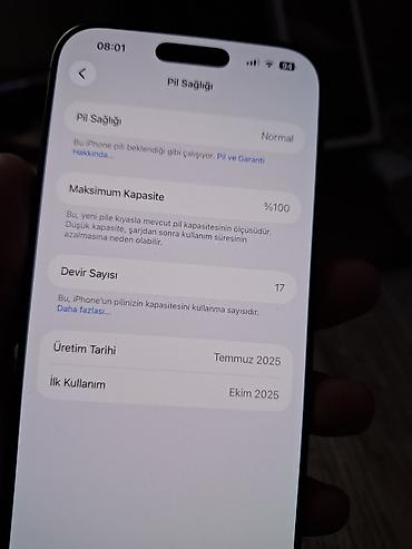 - Batareya sağlamlığı: 100% (Ekran görüntüsündə “Pil Sağlığı – Normal”, maksimum tutum 100%, dövr sayı 17)