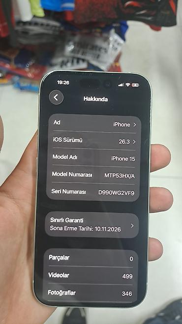 Apple iPhone 15 – ağ rəng Texniki məlumatlar: - Model: iPhone 15 (Model nömrəsi: MTPA3HX/A) - iOS versiyası: 16.2.1 (ekrandakı məlumatlara əsasən) - Ekran: tam ekran OLED Super Retina XDR - Rəng: ...