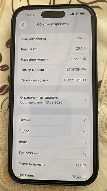 Apple iPhone 14 – 256 GB, Qara Xüsusiyyətlər: - Model: iPhone 14 (Model nömrəsi: MPVX3HX/A) - Rəng: Qara - Yaddaş: 256 GB (təxminən 237,39 GB istifadə üçün əlçatandır) - iOS versiyası: 26.4.1 (ekr...