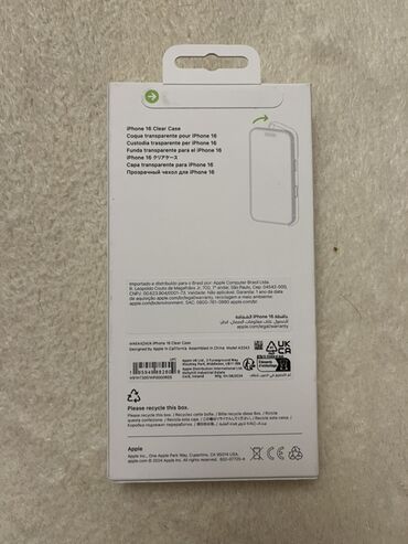 Qutunun üzərində: iPhone 16 Clear Case, MagSafe, çoxdilli məlumat və rəsmi markalanmalar.