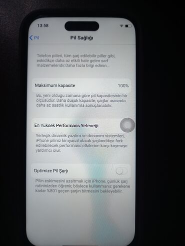 - Batareya: Pil Sağlamlığı bölməsində maksimum kapasite 100% göstərilir; Optimized Battery Charging seçimi mövcuddur