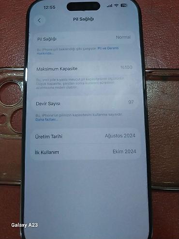 - Şəkillərdə cihazın sistem menyularından pil sağlamlığı və tarix məlumatları göstərilib.