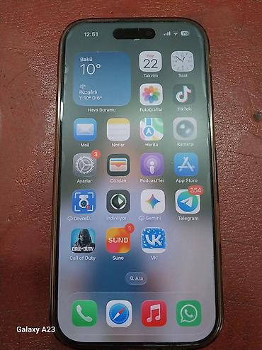 - Ekranda Dynamic Island kəsiyi, arxada üçlü pro kamera modulu və LED fləş aydın görünür.