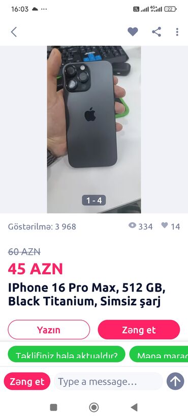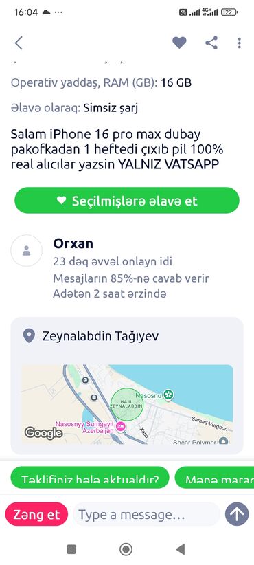 Elan mətnindən qeyd: Dubaydan gətirilib, pakofkadan 1 həftə əvvəl çıxarılıb, batareya 100%. Yalnız WhatsApp yazmağı xahiş olunur.