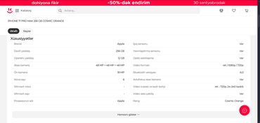 Başqa rəngSatılır Apple-ın iPhone 17 Pro Max 256 GB modeli rəng "Cosmic Orange" rəngi mövcuddur və bu modeldə 256 GB yaddaş, 12 GB RAM, A19 Pro prosessoru, 48 MP üçlü əsas kamera və iOS 26 əməliyyat sistemi kimi xüsusiyyətlər yer alır.