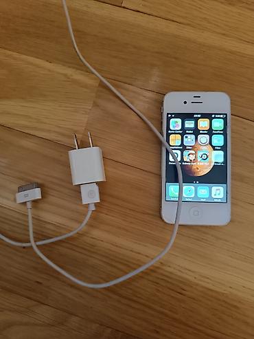 Apple iPhone 4s (ağ rəng), 13 GB daxili yaddaş. Ekran ölçüsü 3.5", Retina display. iOS quraşdırılıb, əsas tətbiqlər işləkdir: App Store, iTunes, Safari, Mail, Kamera və s. Ön və arxa kamera mövcuddur, Wi‑Fi, Bluetooth, GPS dəstəyi var. Fiziki Home düyməsi və 30‑pin konnektorlu port.