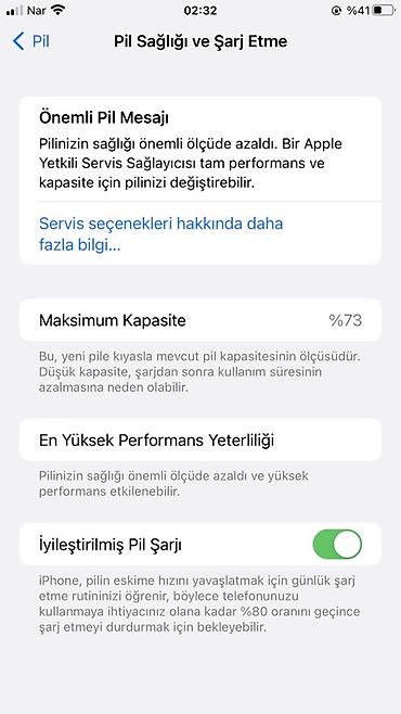 - Batareya bölməsi ekran görüntüsünə əsasən: Maksimum tutum 73%, “İyileştirilmiş Pil Şarjı” aktivdir