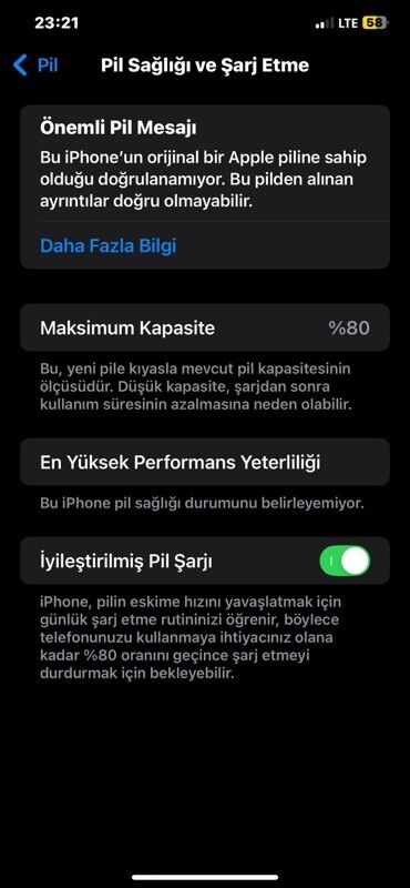 - Batareya məlumatı: Maksimum tutum 80%. Sistem “Bu iPhone’un orijinal Apple pilinə sahib olduğu doğrulanamıyor” mesajını göstərir (şəkildə).