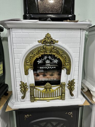 İran istehsalı dekorativ qaz sobası – Behkaran modeli - Klassik kamin görünüşlü dizayn: ağ daş effektli korpus, qızılı relyefli bəzəklər və ön dekorativ barmaqlıq - Ön şüşə pəncərə və idarəetmə pa...