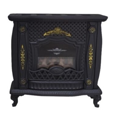 Dekorativ klassik dizaynlı qaz sobası/peçi – BEHKARAN. - Həcmi: 150 kub (otaq ölçüsü üçün nəzərdə tutulub) - Ön paneldə zəngin qızılı bəzəklər, kamin görünüşlü portal - Şüşəli baxış pəncərəsi – al...