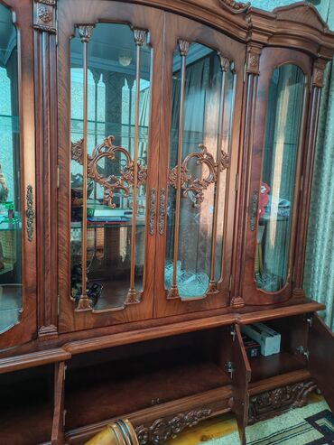 Mebel dəsti – vitrin və bufet güzgü ilə - Dəst tərkibi: - Şüşə vitrindən ibarət şkaf: 3 mərtəbəli şüşə rəflər, şüşə qapı, aşağı hissədə 2 geniş çəkməcə. Fincan, bokal, suvenir və dekor üçün idea...