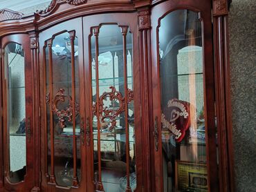 Satılır: ev mebelləri və işıqlandırma dəsti - Şkaf-vitrin: iki hissəli, üst bölmə qapalı dolab, orta hissə mat şüşəli vitrin qapıları üzərində naxışlı dekor, aşağıda açıq rəf bölmələri və çekmece....
