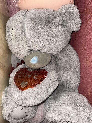 - Model 1: Boz rəngli, klassik “patch” detallı ayı. Sinəsində parlaq payetli ürək var, üzərində LOVE yazısı yerləşir. Yumşaq, sıx doldurulmuş, qucaqlamaq üçün ideal. Dekor və hədiyyə üçün romantik seçimdir.