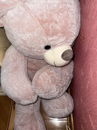 - Model 2: Pudra/çəhrayı rəngli iri ayı. Yumru burnu və qara gözləri ilə minimal dizayn. Parça toxuması məxməri kimi yumşaqdır, uşaq otağı və ya yataq otağı üçün xoş aksesuar.