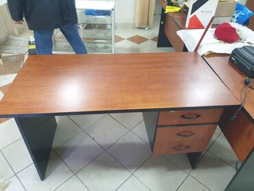 - İş masası: geniş iş səthi, sağ tərəfdə 3 ədəd çekmece (üst çekmece kilidlidir). Melamin/laminat taxta teksturalı üstlük, qara konturlar.