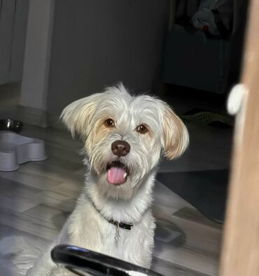 Породистый.Смесь Мальтезе с другой породой.Прививки есть.Ест только корм,предназначенный для собак.