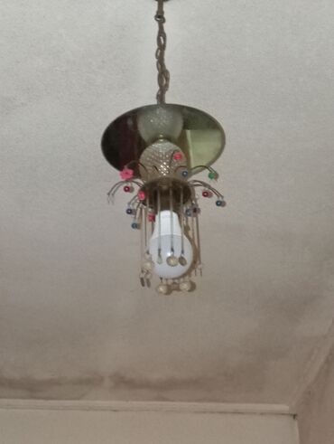 - Tavan asma lustra: metal korpus, zəncirli asqı, güzgülü üst panel və dekorativ rəngli bəzəklər. E27 patrondur. Aşağı hissədə şüşə diffuzor və asma elementlər var. Otağa yumşaq işıq və dekorativ görünüş verir.