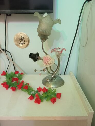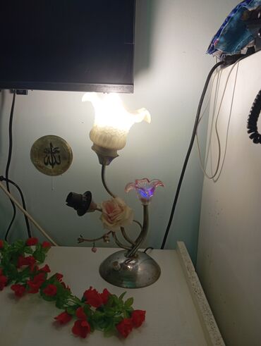 - Masa lampası: gümüşü metal gövdə, çiçək formalı iki şüşə plafon və dekorativ gül elementləri. Korpus üzərində açma/söndürmə düyməsi mövcuddur. Bir plafonda E27 patron, digərində kiçik LED işıqlandırma yerləşir (şəkildə yanma rejimi göstərilib). Gecə lampası və dekorativ aksent kimi uyğundur.