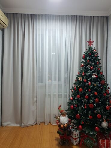 - Tərkib: ikiqat pərdə sistemi – sıx toxumalı açıq boz/qırıq-ağ qatı pərdə və şəffaf ağ tül.