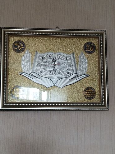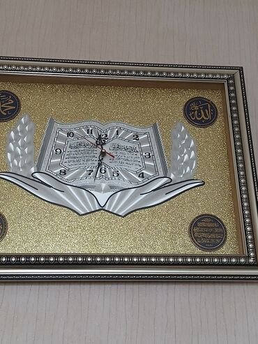 Dini temalı divar saatı - Dikdörtqan formalı çərçivə: qızılı rəngli, dekorativ işləmələr və incivari bəzəklər. - Ön hissə şüşəlidir; iç dizaynda açıq Qurani-Kərim təsviri və dua edən əllər motivi ...