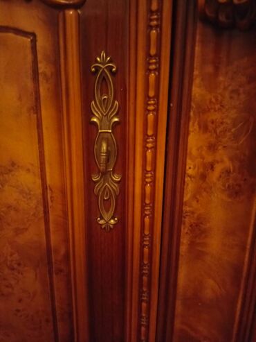 Taxta rəngində, klassik dizaynlı şkaf - Material: ağac fakturalı laminat/DTD, ön hissədə dekorativ taxta elementlər və oyma çərçivələr - Konstruksiya: təkqapılı korpus + yuxarı bölmə ilə iki mərtə...