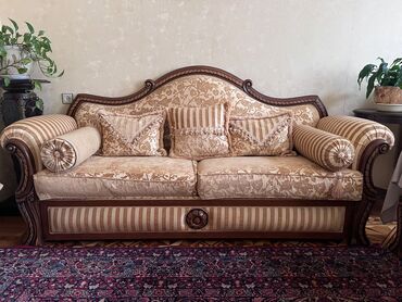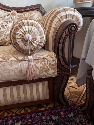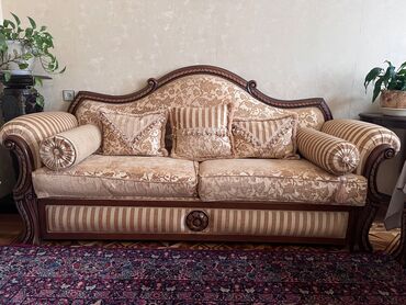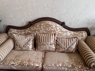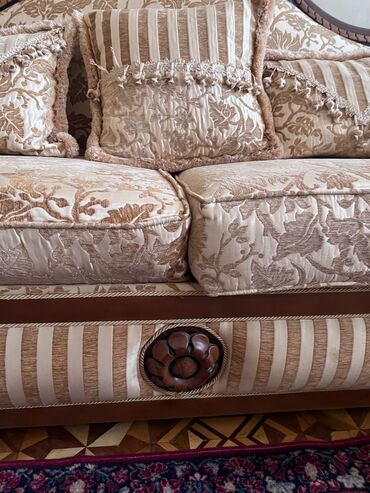 Klassik dizaynlı yumşaq mebel dəsti Tərkib: - 1 ədəd 3 nəfərlik divan - 2 ədəd kreslo Dizayn və material: - Qəhvəyi və bej rənglərin kombinasiyası - Naxışlı parça üzlük, yumşaq sünger dolğu - Tax...
