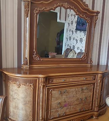 Klassik üslubda qonaq otağı üçün mebel dəsti Tərkib: - Böyük güzgülü konsol/komod: yuxarıda dekorativ oyma çərçivəli geniş güzgü, aşağıda isə mərkəzdə 3 böyük çekmece, üst hissədə əlavə dar çekmec...