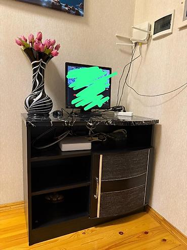 3) Kiçik TV/komod şkafı – açıq rəf bölmələri və bir qapalı şkaf; üstü mərmər teksturalı dekorla.