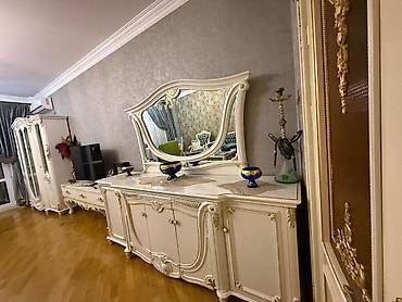 - Konsol-bufet: Geniş üst səth, ortada 2 qapılı dolab, hər iki tərəfdə ayrıca qapılı bölmələr və çekmecələr. Üstündə iri bəzəkli güzgü. Fasadda vitrindəki kimi oyma və qızılı akssentlər.