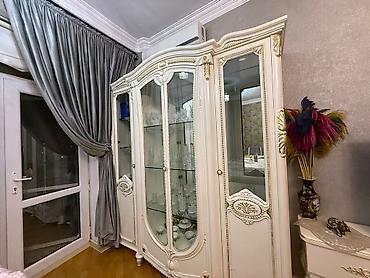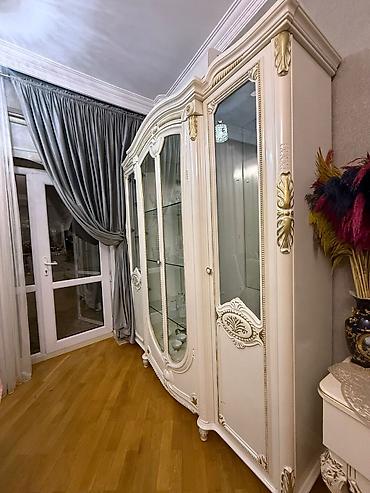 - Vitrin şkaf: 4 qapılı kompozisiya. Mərkəzdə iki şüşə qapı və içəridə iki səviyyəli şüşə rəflər, yanlarda isə güzgülü/şüşəli bölmələr. Dekorativ oyma elementlər və qızılı naxışlarla bəzədilib. Əyri xətli fasad, frezeli çərçivələr, qabarıq plintus və balaca dekor ayaqlar.