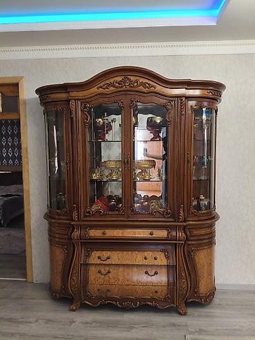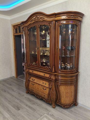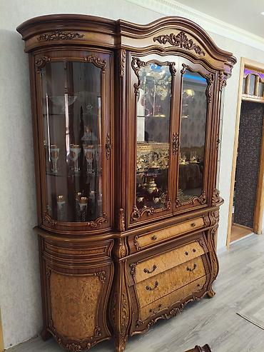 Klassik üslubda vitrin-bufet dəsti.100 manat - Material: ağac karkas, oyma dekorativ elementlər - Rəng: isti qoz tonları - Üst hissə: şüşəli vitrin bölməsi, 4 ədəd şüşə qapı; daxilində güzgülü arx...