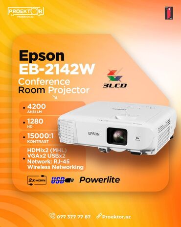 Proektor Epson Yeni, qutusunda. Say var 1 il yazılı Zəmanət verilir. cox işıqlı göstərir 17 000 saat lampa òmrù Full HD 4000 ansi lumen 16 000 : 1 kontrast 2 x HDMİ Vga 1920 full HD Lan RJ45 USB ...